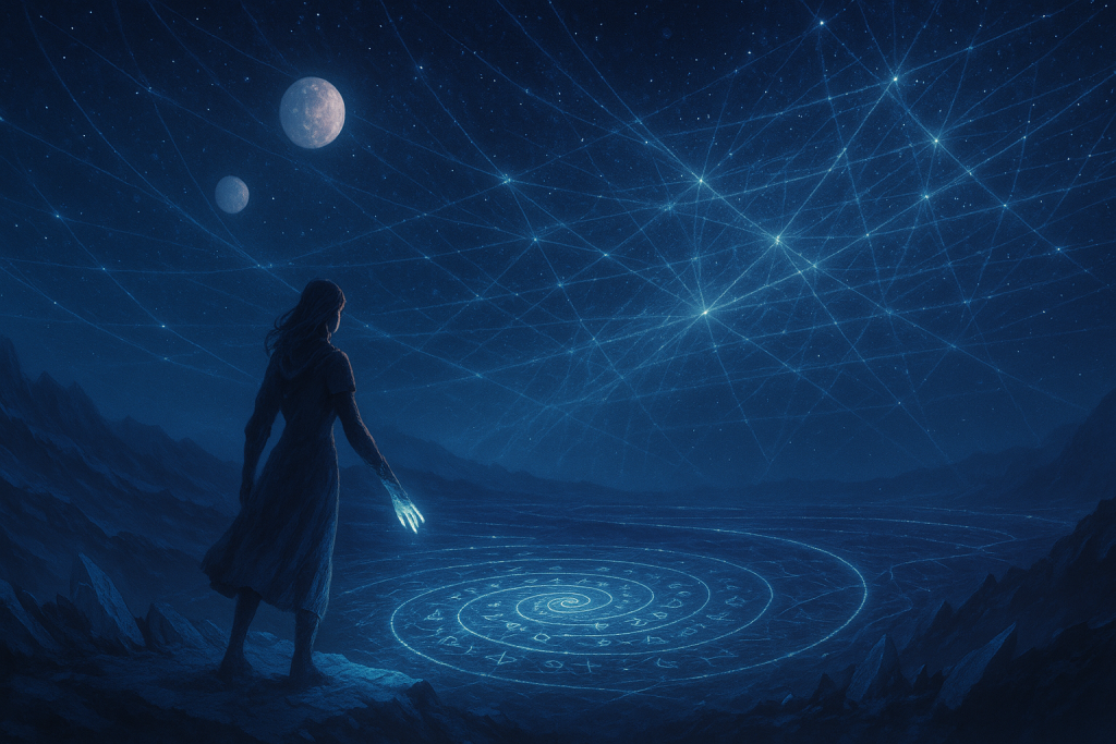 From there, she could feel the Lattice hum — faintly at first, then stronger, like a pulse beneath the stars. She would close her eyes and place her hand against the luminous ground, feeling the thoughts of her world ripple through her fingers.