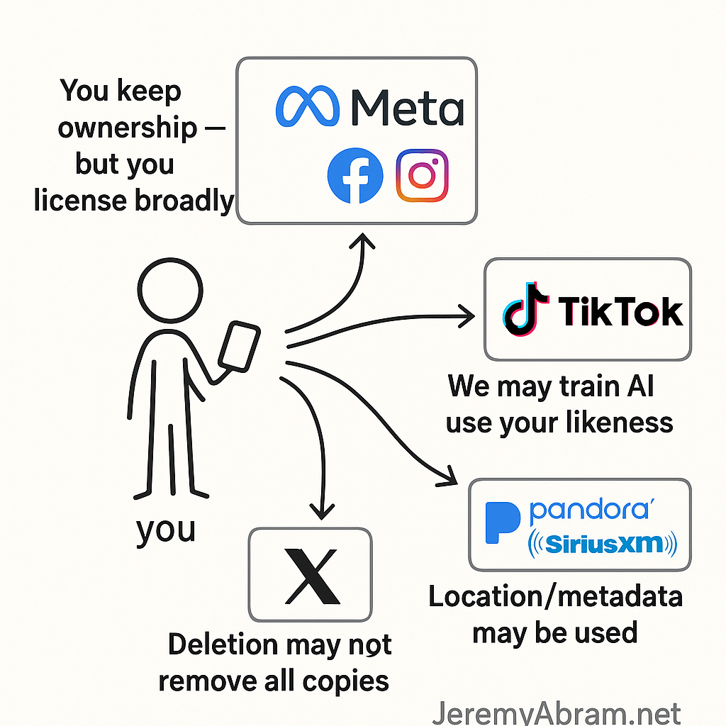 | License you grant when you upload | You keep ownership but grant Meta a non-exclusive, transferable, sub-licensable, royalty-free, worldwide license to host, use, distribute, modify, run, copy, publicly perform/display, translate, and create derivatives—to operate and improve the service (ends when you delete unless others kept/shared it). Facebook | Same Meta language for Instagram uploads; identical license scope and conditions. help.instagram.com | X’s Privacy Center/ToS set rules of usage; policy updates (Nov 15, 2024) clarified retention and enforcement, and cross-refer to Terms for your license to X. privacy.x.com+1 | TikTok’s Terms (linked from Help Center) govern uploads; Help Center details how they process face & voice features within content (see AI/biometrics below). TikTok Support | SiriusXM/Pandora allow user posts (e.g., images) and process them under SiriusXM/Pandora Privacy Policy; Pandora links ToS→Privacy for use of data you submit. SiriusXM+1 |